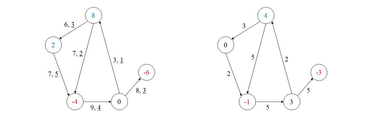 - 흐름 보존 제약: 모든 정점에 대해 그 정점에서 흘러 나가는 양은 그 정점에서 생산된 양과 그 정점으로 흘러 들어오는 양과 동일하다. 즉, 임의의 \(v \in V\)에 대해, \[ \sum_{e \text{ out of } v} f(e) - \sum_{e \text{ into } v} f(e) = q(v)\]를 만족한다.