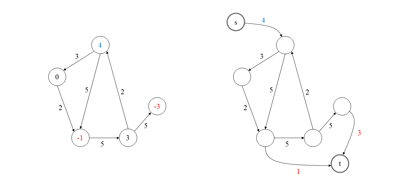 - \(E' := E' \cup \{\langle s, v \rangle \mid q(v) > 0 \} \cup \{ \langle v, t \rangle \mid q(v) < 0 \} \)