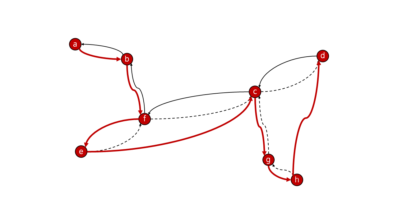 마지막으로 \(C\)에 남은 \(c\), \(f\), \(b\) 모두 방문을 한 정점들이기 때문에 시작 정점 \(a\)로 바로 shortcut합니다. 그러면 다음 그림과 같은 Hamiltonian cycle을 얻을 수 있게 됩니다.