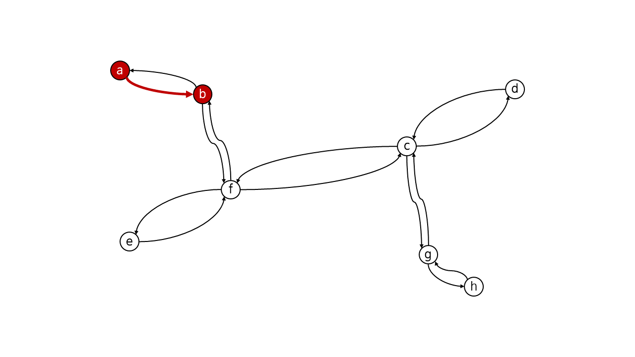 Eulerian circuit \(C\)에 따르면, 다음에 방문한 정점은 \(b\)입니다. 아직 우리는 \(b\)를 방문하지 않았으므로 방문해줍니다.