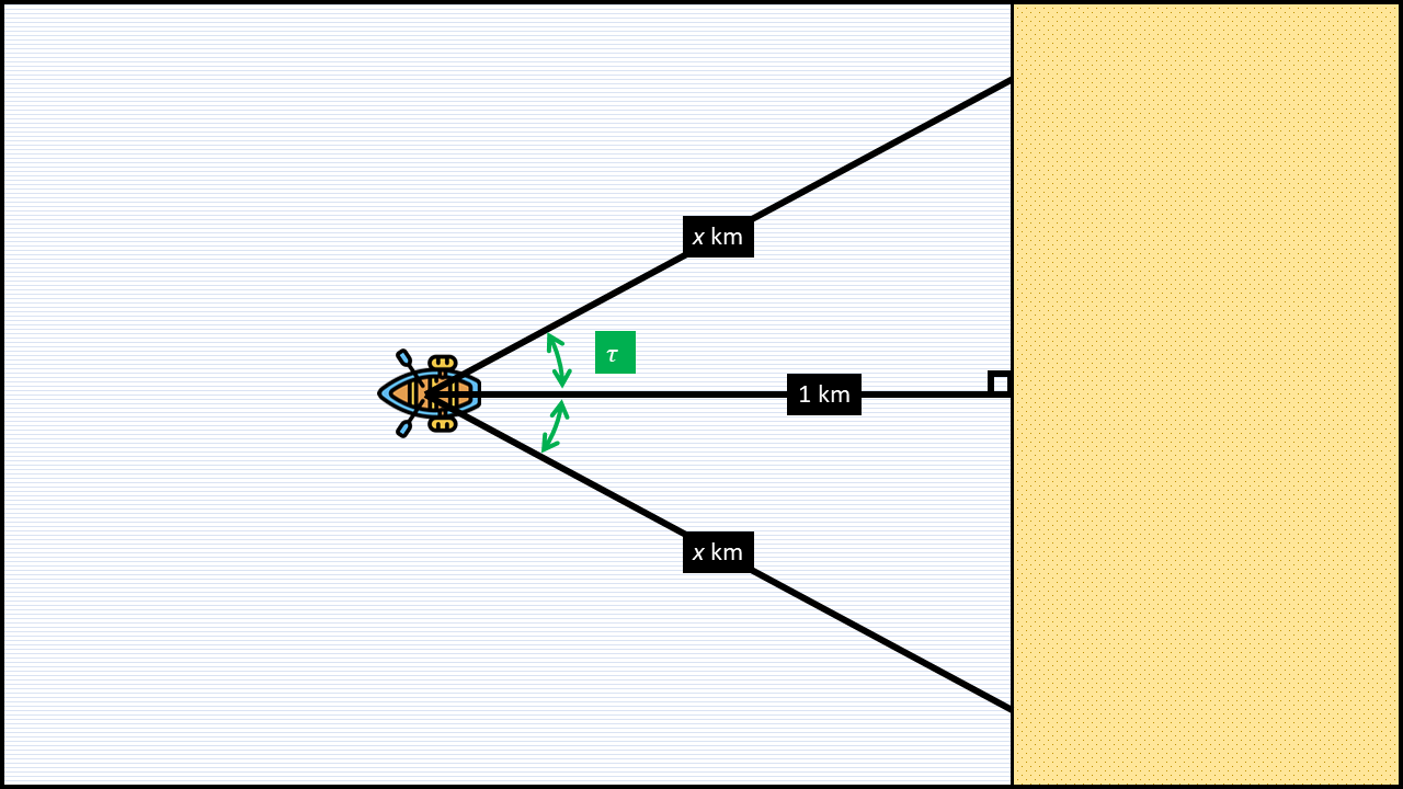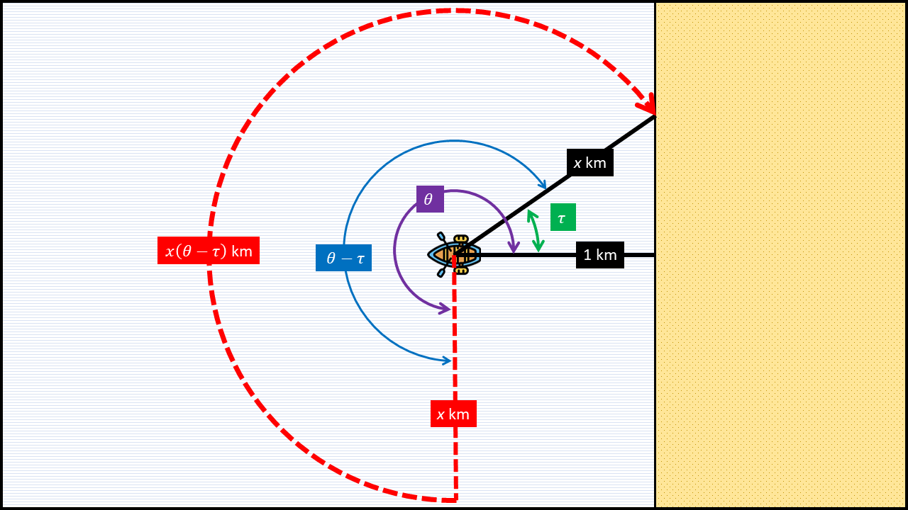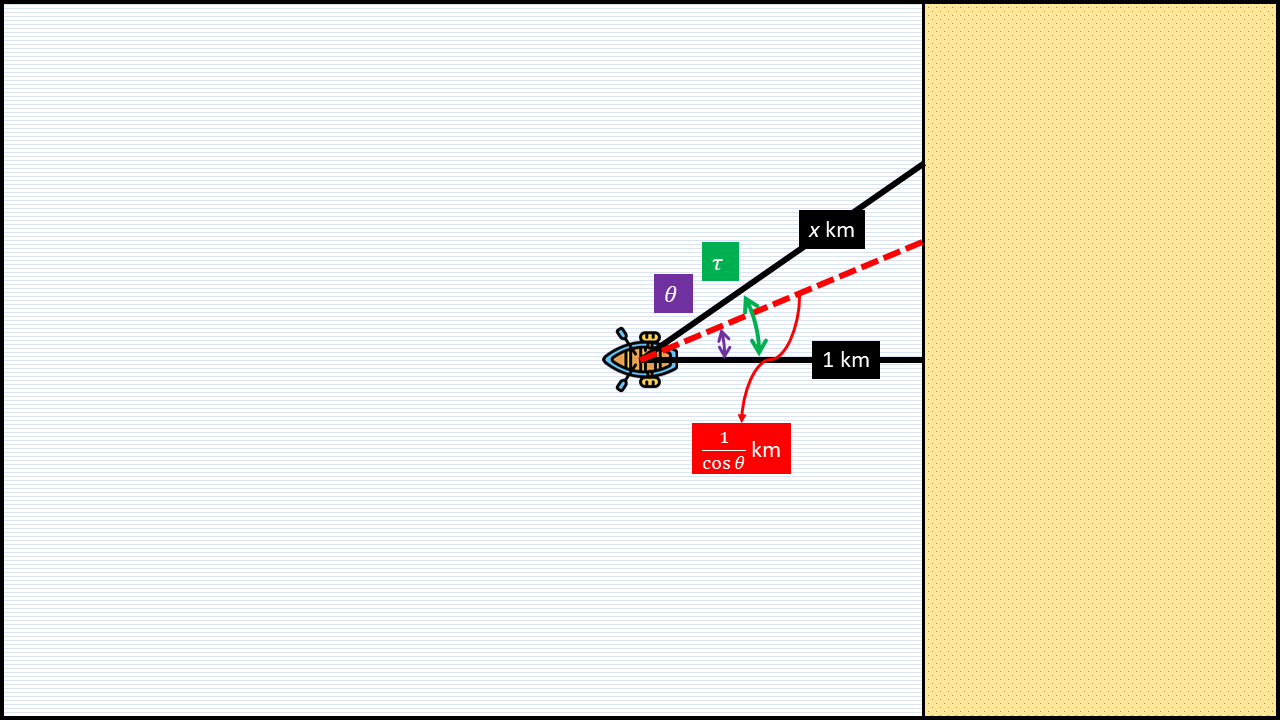 먼저 직선 항해로 해변에 도달할 수 있는 방향을 구해보도록 하겠습니다. 이는 그림 5를 보면 쉽게 알 수 있습니다. 빗변의 길이가 \(x\) ㎞, 밑변의 길이가 1 ㎞인 직각삼각형에서 이 두 변의 끼인각을 \(\tau\)라고 하겠습니다. 다시 말해, \[ \tau := \cos^{-1} \left( \frac{1}{x} \right)\]입니다. 그러면 수평 방향을 곧장 해변에 도달할 수 있는 기준 방향으로 정했을 때, 좌우로 \(\tau\) 이내의 방향으로 움직였다면 곧장 해변에 도착할 수 있게 됩니다.