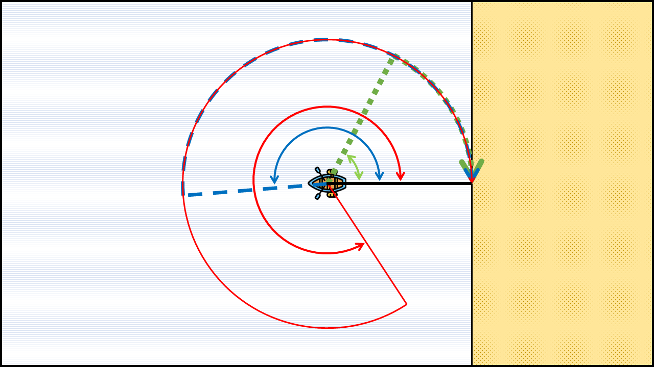 대신 이 어부는 이 상황을 타개할 만한 기술을 두 가지 갖고 있습니다. 하나는 원하는 거리만큼 정확히 직선으로 가는 것이고, 다른 하나는 아무 원의 호를 따라서 원하는 만큼 움직일 수 있는 것이죠.(쩌네요.) 우리의 목표는 어부가 최대한 짧은 거리를 움직여 해변에 다다르는 방법을 찾는 것입니다.