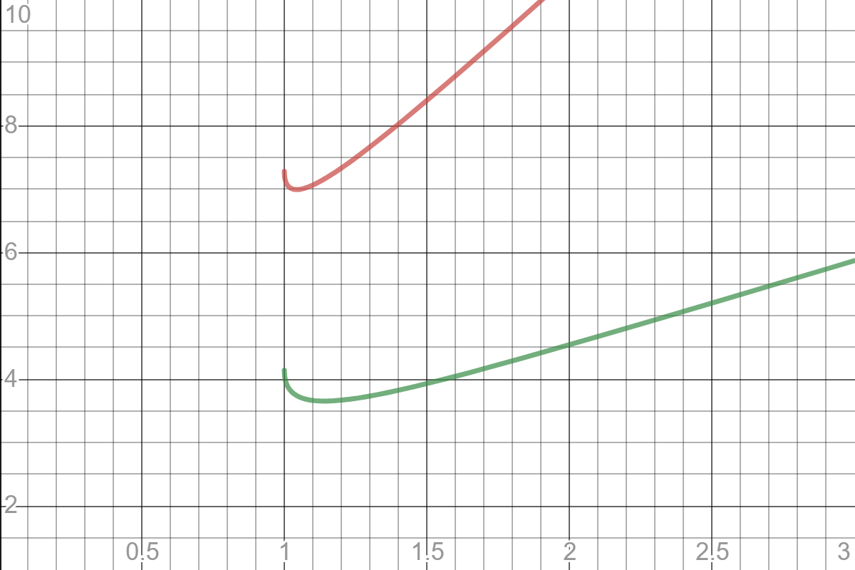 이를 이용하면 두 번째 방법을 사용했을 때 최악의 경우 얼마큼 움직여야 하는지를 알 수 있습니다. 일단 직선으로 움직인 거리는 \(x\) ㎞입니다. 그리고 만약 수평 방향을 기준으로 뱃머리를 오른쪽으로 \(\tau\)보다 약간 더 돌렸다면 거의 \( x (2 \pi - 2 \tau) \)의 거리를 움직이게 됩니다. 따라서 \(x\)가 주어졌을 때, 두 번째 방법이 움직이는 거리는 최대 \[ d(x) := x + x(2\pi - 2\tau) = (1 + 2\pi) x - 2 x \cos^{-1}\left( \frac{1}{x} \right) \]가 됩니다. 위 식은 \(x \approx 1.044\)일 때 \( d(x) \approx 6.995 \)를 최솟값으로 갖습니다. 따라서 두 번째 방법은 \(x\)를 \(1.044\) 정도로 잡았을 때 첫 번째 방법보다 최악의 경우에도 약 \(0.288\) ㎞ 정도 더 짧은 경로를 탄다는 것을 알 수 있습니다.