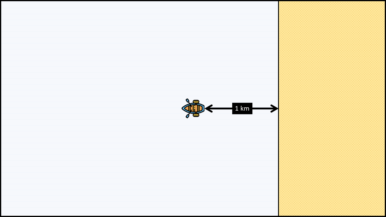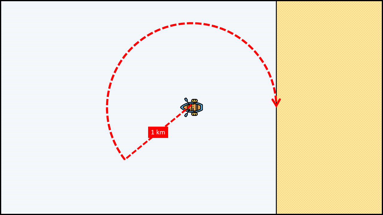 위 영상에서 소개된 방법을 설명드리도록 하겠습니다. 아이디어는 간단합니다. 처음 위치를 중심으로 1 ㎞ 이상의 반지름을 갖는 원을 따라 움직이면 언젠간 해변에 다다른다는 것입니다. 첫 번째 방법으로, 먼저 아무 방향을 정한 후 정확히 1 ㎞를 직진한 후에 처음 위치를 중심으로 반지름이 1 ㎞인 원을 따라 시계 방향으로 움직여 보도록 하겠습니다.