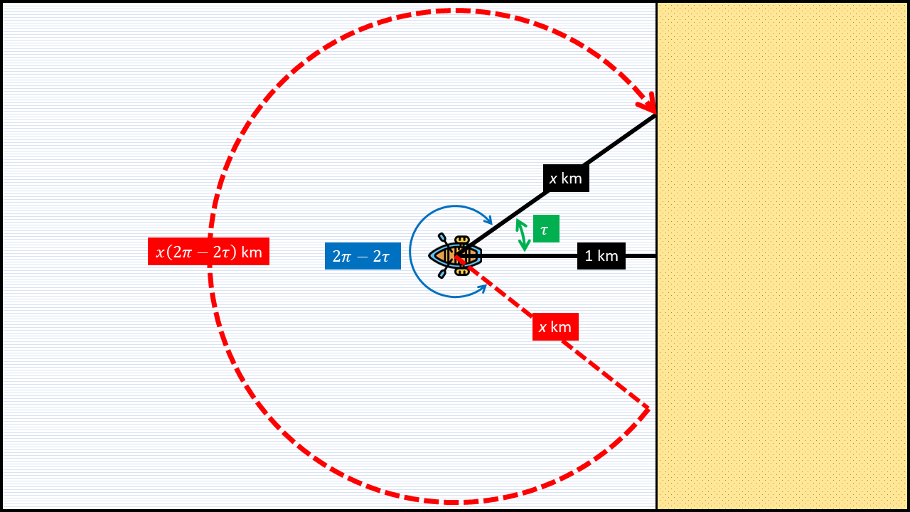 두 번째는 직선 항해로 바로 해변에 도착하지 못하는 경우입니다. 이는 \( \tau < \theta < 2 \pi - \tau\)일 때 발생하게 됩니다. 그림 9에서 볼 수 있듯이, 이때 배가 이동하는 거리는 직선 거리에 원을 따라 돌아가는 거리를 더한 것이므로 \[ d_x (\theta) = x + x(\theta - \tau) \tag{3} \]라는 것을 알 수 있습니다.