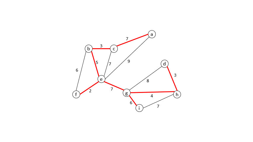 예를 들어 다음과 같이 어떤 그래프가 주어지고 우리 알고리즘이 이에 맞는 최소 신장 포레스트를 찾았다고 합시다.